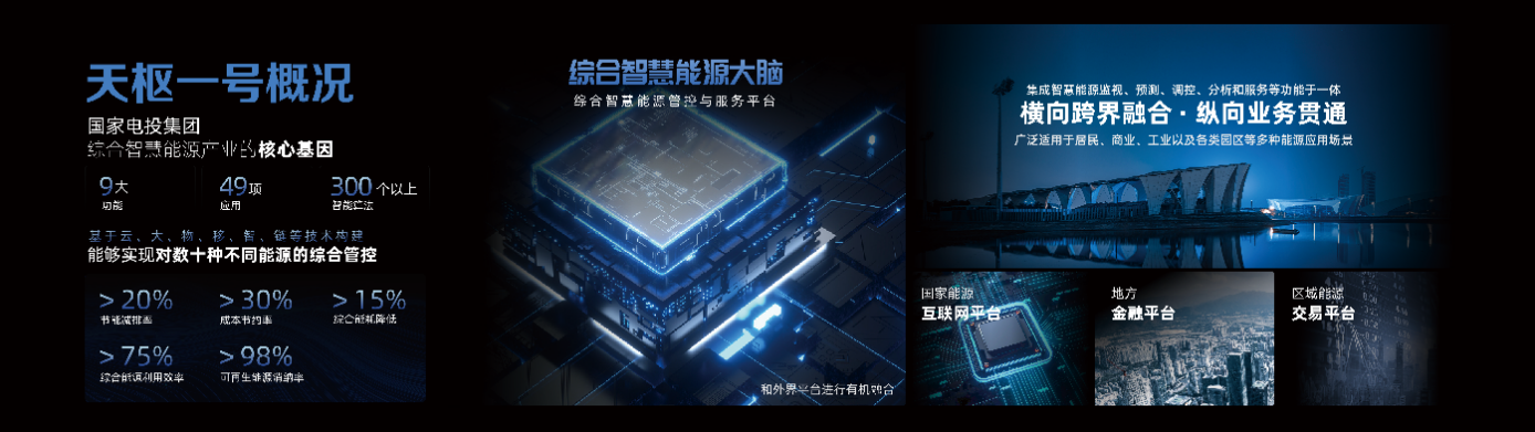“天樞一號”綜合智慧能源管控與服務(wù)平臺,是集團公司綜合智慧能源產(chǎn)業(yè)的核心基因,是集團公司綠色發(fā)展品牌形象的重要載體,集成智慧能源監(jiān)視、預(yù)測、調(diào)控、分析和服務(wù)等功能于一體,廣泛適用于居民、商業(yè)、工業(yè)以及各類園區(qū)等多種能源應(yīng)用場景!疤鞓幸惶枴辈捎谩皺M向跨界融合、縱向業(yè)務(wù)貫通”的系統(tǒng)集成理念,對智慧城鎮(zhèn)、集群樓宇、產(chǎn)業(yè)園區(qū)和能源基地等多個類別的能源系統(tǒng)進行集成,滿足支撐數(shù)據(jù)共享、安全通信、互聯(lián)互通、場景聯(lián)動、靈活參與,實現(xiàn)業(yè)務(wù)融合和少人值守,為綜合智慧能源多區(qū)域、多場景的管理提供統(tǒng)一的解決方案?蓭椭茉垂居赡茉垂⿷(yīng)商向綜合能源服務(wù)商轉(zhuǎn)變,實現(xiàn)一站式綜合服務(wù),給用戶提供電、熱、冷、氣、水等多種能源及相應(yīng)配套運維服務(wù)。還可以和國家能源互聯(lián)網(wǎng)平臺、區(qū)域能源交易平臺、地方金融平臺等外界平臺進行有機融合,實現(xiàn)全國跨服務(wù)區(qū)域的資源調(diào)配,確保項目運營過程資源、資金安全,并為區(qū)域后續(xù)項目預(yù)留接口,實現(xiàn)一平臺全方位服務(wù)。