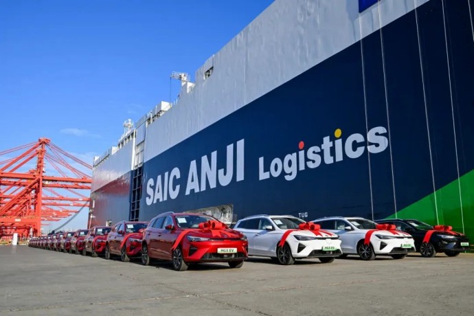 上汽集團旗下9500車位遠(yuǎn)洋汽車運輸船“安吉安盛”輪搭載著上汽自主品牌車型駛往歐洲