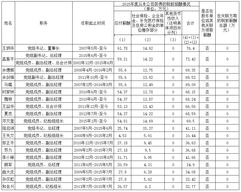 備注:上表披露信息為我公司企業負責人2015年度全部應發稅前薪酬,按國家規定由單位繳存各種社會保險等。其中,第(1)項由國務院國資委核定。