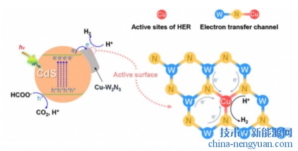 近期,西安交通大學(Xi’an Jiaotong University)、華南大學(University of South China)和合作研究所的一個研究小組在《碳能源》(Carbon Energy)雜志上報告了一項進展(DOI:10.1002/cey2.70024)。該研究提出了一種含有原子分散銅位的Cu-W2N3助催化劑,當與CdS結合時,它顯著提高了甲酸光重整產氫的效率。新體系具有更高的活性和近95%的氫選擇性,優于傳統的助催化劑。這項工作揭示了如何在助催化劑表面上定制單原子位點,從而有效地指導反應途徑,以產生清潔的氫。