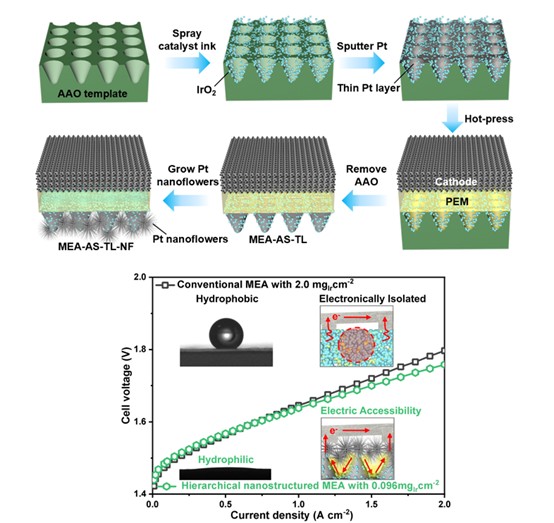 近期,中國科學院上海高等研究院研究團隊,提出“錐狀陣列+超薄Pt層+Pt納米花”的多層級結構設計理念。研究通過精準構建納米壓印光刻、離子濺射、原位生長三步工藝,可同時解決傳統MEA導電性和傳質受限兩大痛點。同時,超薄Pt層兼具使面內導電性提升12.3倍,并作為成核位點誘導Pt納米花生長的雙重功能,可實現結構與性能協同優化,進而實現0.096mg cm??低Ir負載下的高性能,較傳統MEA節省95%以上Ir,且在2.0A cm??下槽壓(1.758V)優于高Ir負載的傳統MEA(1.797V@ 2mg cm-2),為質子交換膜水電解的低Ir化應用提供了新思路。