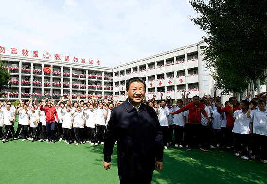 9月13日至14日,中共中央總書(shū)記、國(guó)家主席、中央軍委主席習(xí)近平在陜西省榆林市考察。這是14日上午,習(xí)近平同綏德實(shí)驗(yàn)中學(xué)的學(xué)生在一起。新華社記者 李學(xué)仁 攝