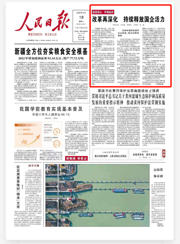 2月18日,《人民日報》第 27251 期頭版報眼位置刊發《改革再深化 持續釋放國企活力(堅定信心 開局起步)》一文。報道介紹了國家電投發揮董事會“定戰略、作決策、防風險”作用,董事行權履職能力有效提升。還介紹了通過優化國有經濟布局,我國生物質發電領域龍頭企業國能生物重組進入國家電投。國家電投旗下的吉電配售電公司通過健全創新市場化經營機制,30多名員工組建的電量市場開發營銷隊伍中,每人都簽訂了市場化薪酬協議書,員工積極性進一步提升。以下為報道全文: